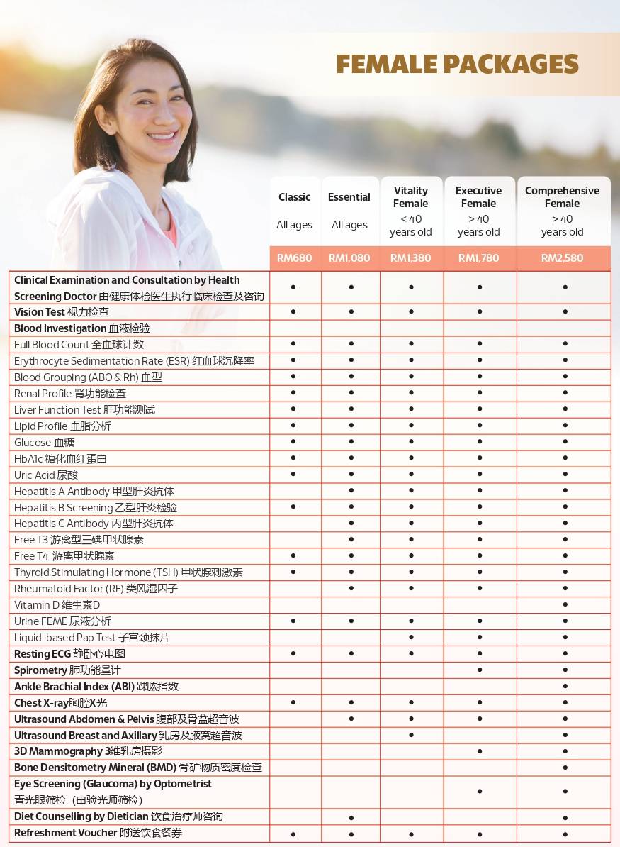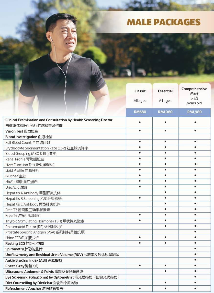 - Applicable packages: Men’s and Women’s Health Screening Packages